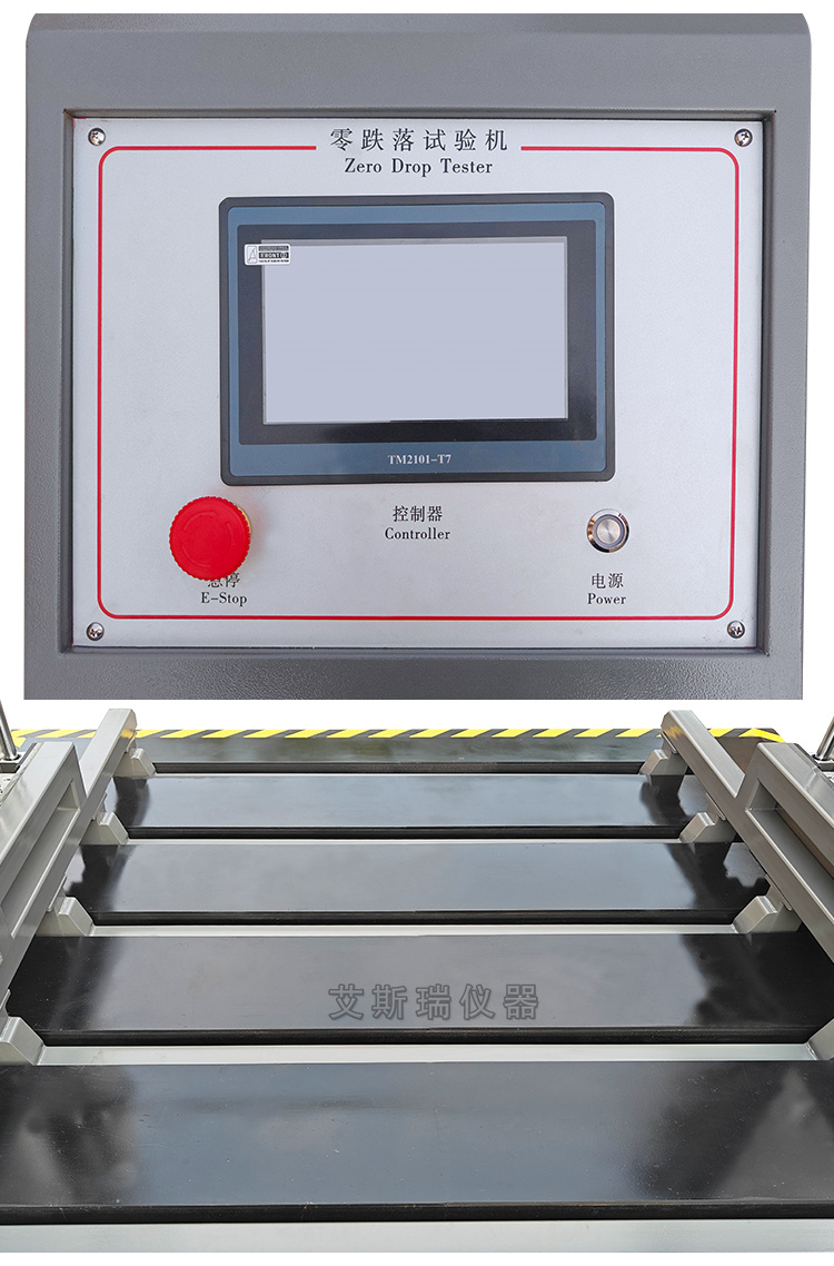 對于大型包裝貨物,一般質量較大,在運輸,搬運時垂 直跌落的高度較低,因此,要求跌落試驗臺的試驗跌落高度也較低,零跌落試驗機主要用于較大型包裝件作跌落試驗。零跌落試驗機由一個可以快速向下移動的“E”型叉作為試件托架,被試貨物按試驗要求(面,棱,角試驗)放置平衡。試驗時,托板高速向下運動,脫離試件,“E”型叉在被試包裝貨物跌落至底板前,已在有效減振器的作用下,嵌平于底板,從理論上,零跌落試驗機可從零高度至跌落高度范圍作跌落試驗。